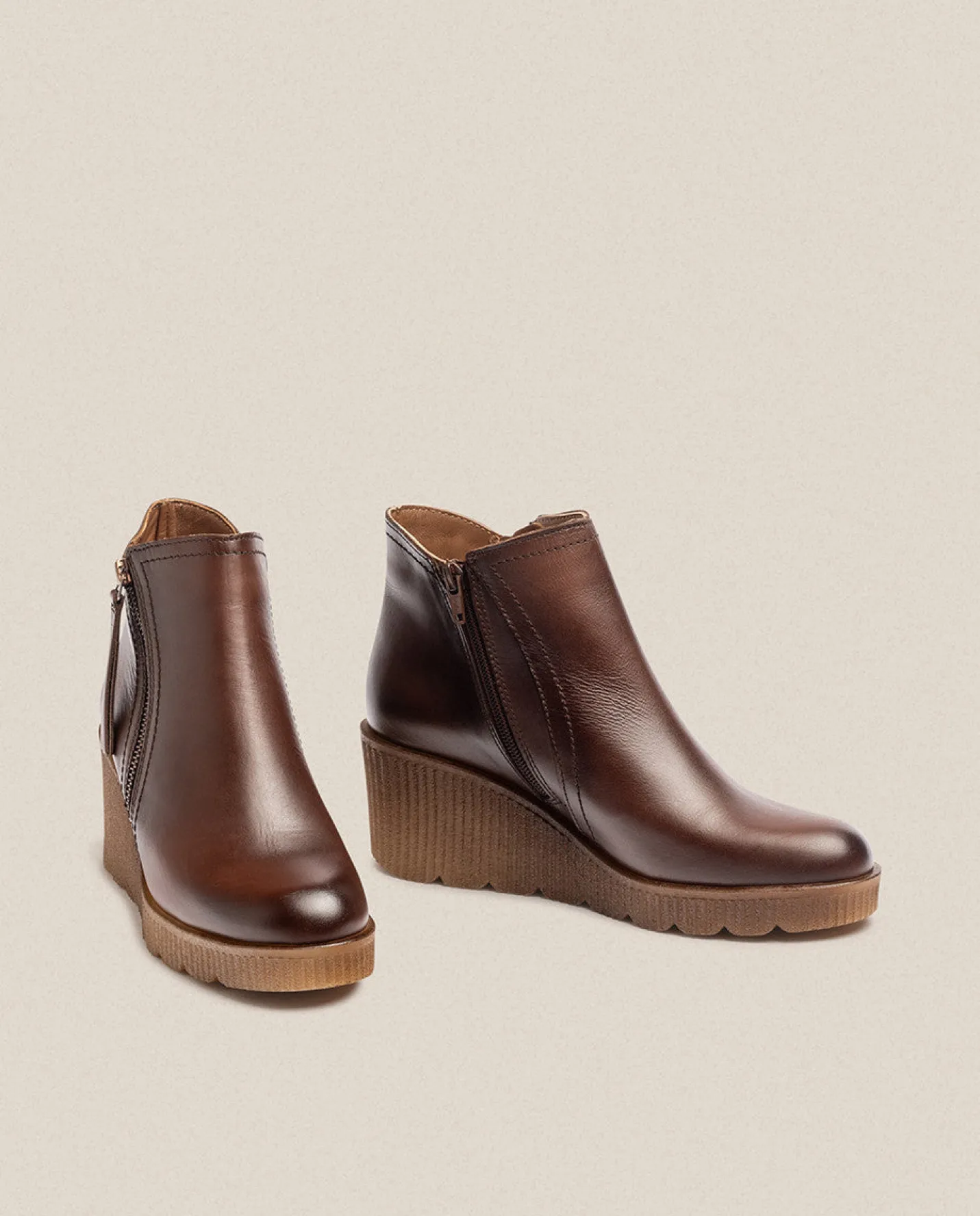 El botín de cuña MADONA 007 en marrón, promete la máxima comodidad en tu día a día. Su diseño minimalista hacen de él un imprescindible en nuestro armario, resaltable su suela de un tono beige con relieve. Cremallera para facilitar el calce. Corte en piel vacuna y elaborado en España de manera artesanal y tintes vegetales respetuosos con el medio ambiente.