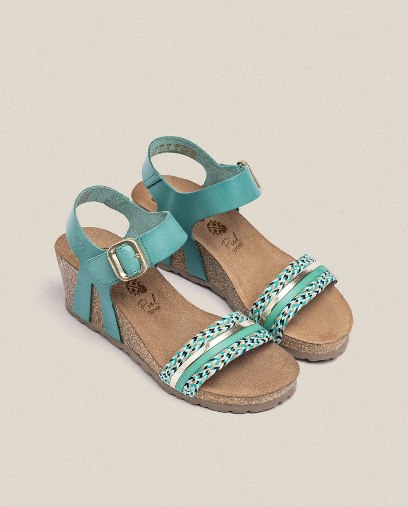 La sandalia de cuña CADIZ, esta vez con detalles llamativos en la tira delantera que sujeta los dedos. Color azul y cierre de velcro con hebilla decorativa para facilitar el calce. Tiene una cuña de 5,5 cm y una plantilla antideslizante que garantiza el agarre. Está elaborada de manera artesanal en España, material de piel y uso de tintes vegetales respetuosos con el medio ambiente.