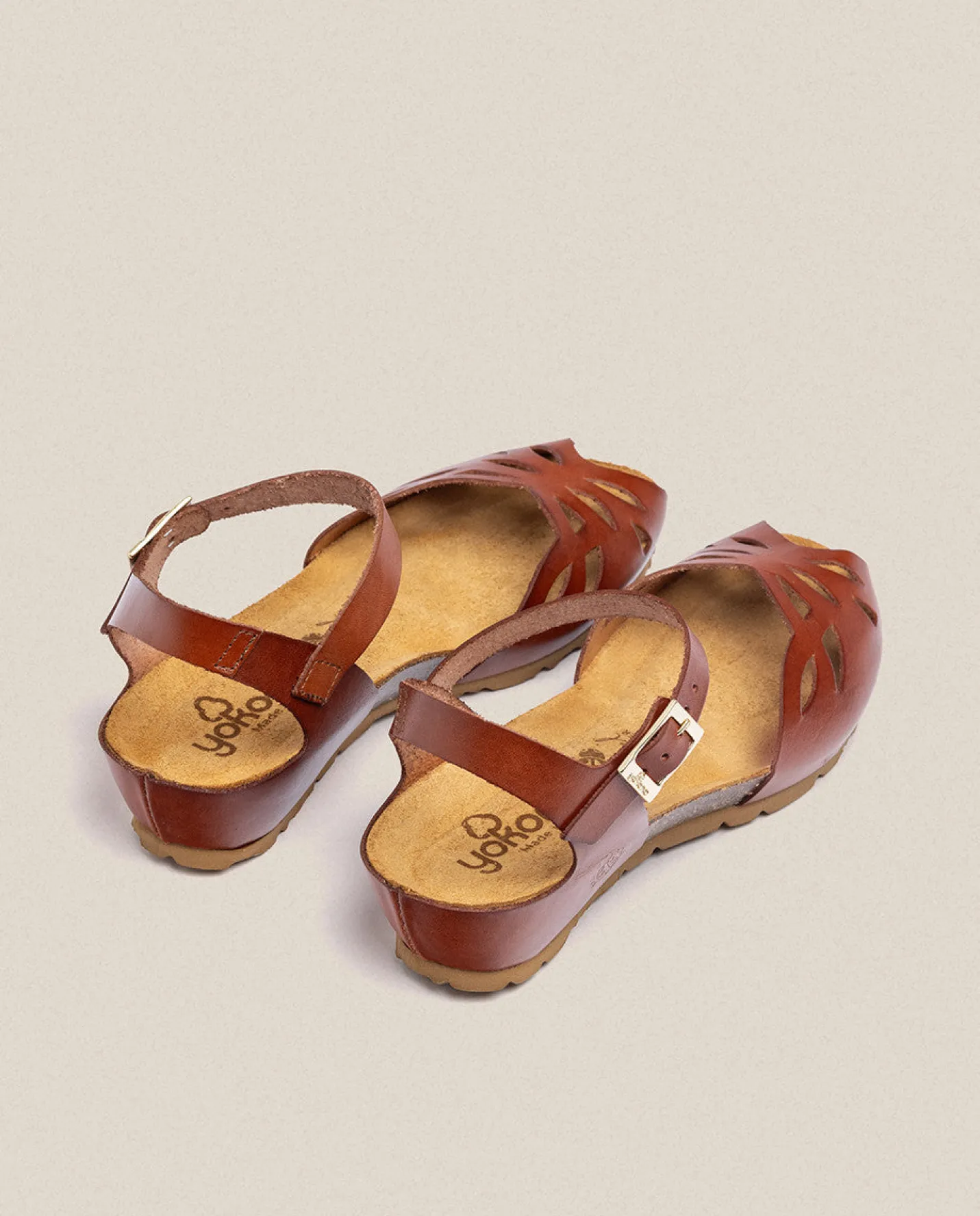 Sandalia de cuña de color marrón con una altura de 3,5 cm. Diseño troquelado que favorece cualquier look. Este modelo es indispensable para estrenar el verano. Cierre de hebilla. Corte de piel vacuna. Plantilla acolchada y antideslizante que añade un extra de comodidad. Elaborada mediante un proceso de fabricación artesanal que usa tintes vegetales y embalajes sostenibles para respetar el medio ambiente. Fabricada en España.