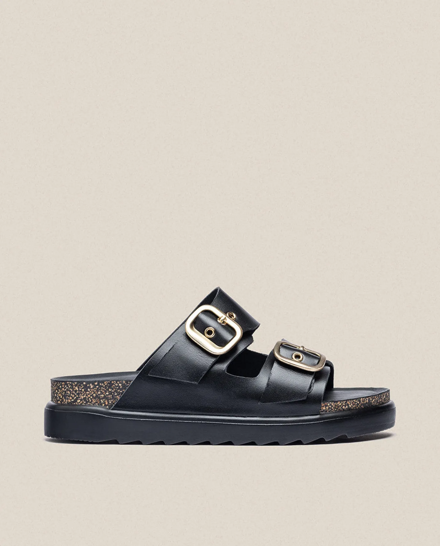 La sandalia de plataforma TUNEZ 130 en negro, la sandalia más sencilla de toda la línea TUNEZ. No cuenta con ningún tipo de cierre, pero sí con dos hebillas doradas en las tiras del empeine que permiten adaptarlas a tus pies. La sandalia de plataforma ideal para tus planes del día a día.Plataforma de 4 cm y una plantilla antideslizante que garantiza el agarre del pie. Está elaborado de manera artesanal en España, material de piel y uso de tintes vegetales respetuosos con el medio ambiente