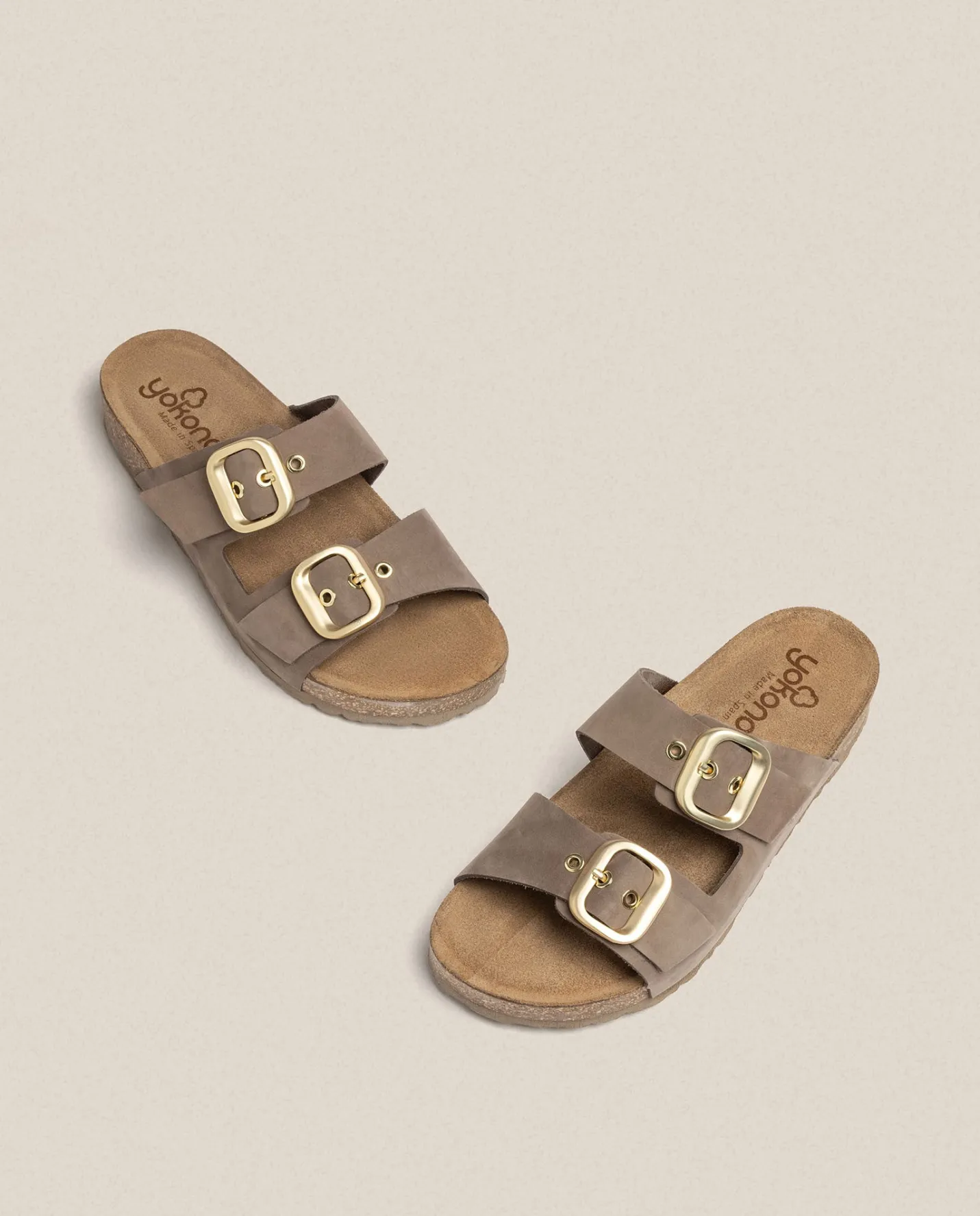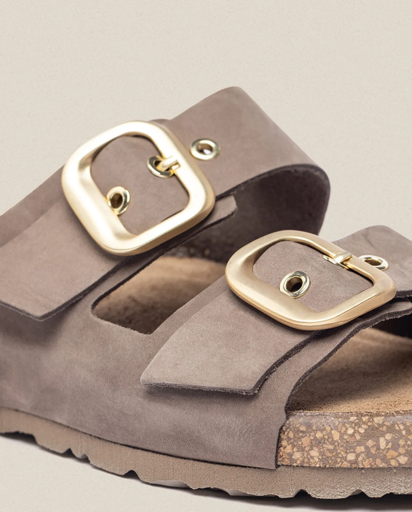 La sandalia plana JERBA 136 en marrón, con dos tiras que cubren el empeine y dos hebillas doradas para que se ajuste co…