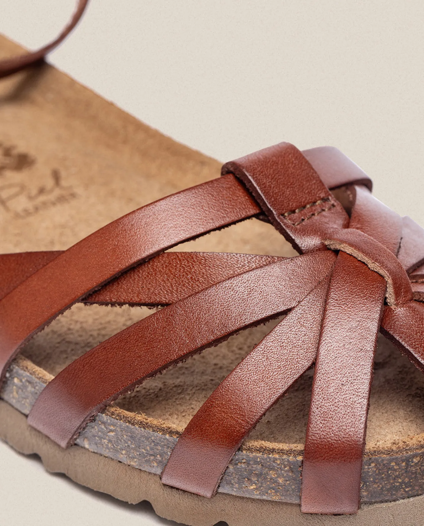 Sandalia plana de color nuez con una altura de 2 centímetros. Cuenta con un cierre de hebilla que se ajusta al tobillo a la perfección y un diseño elaborado con finas tiras de vaquetilla que no dejan indiferente a nadie. Por algo es uno de los modelos más exitosos cada verano. Luce nuestro modelo icónico con tu look más cómodo y fresco. Fabricado en España