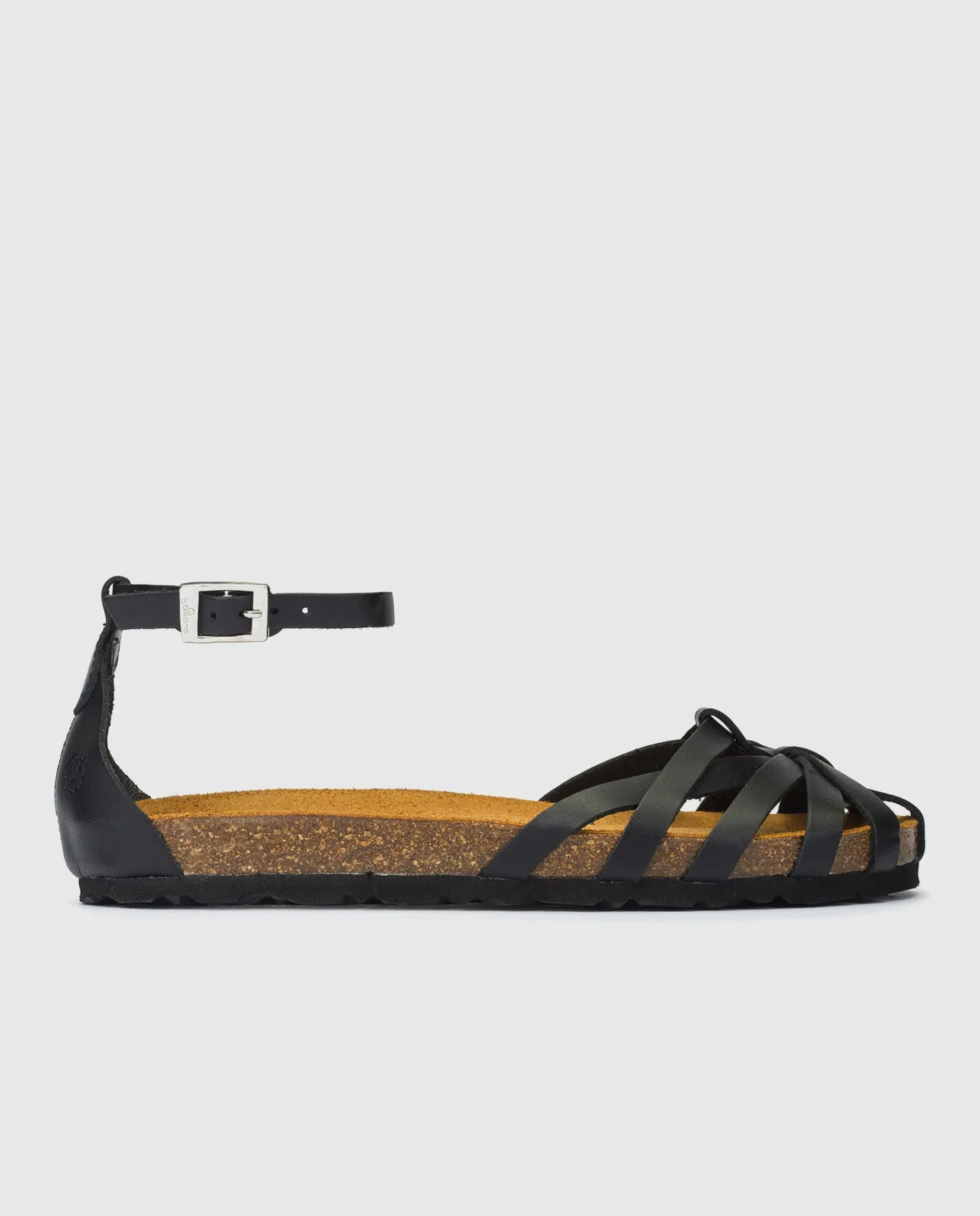 Sandalia plana de color negro con una altura de 2 cm. Diseño de punta cerrada que no te dejará indiferente. Por algo es nuestro modelo icónico estrella cada año. Cierre de hebilla. Corte de piel vacuna. Plantilla acolchada y antideslizante que añade un extra de comodidad. Elaborada mediante un proceso de fabricación artesanal que usa tintes vegetales y embalajes sostenibles para respetar el medio ambiente. Fabricada en España.
