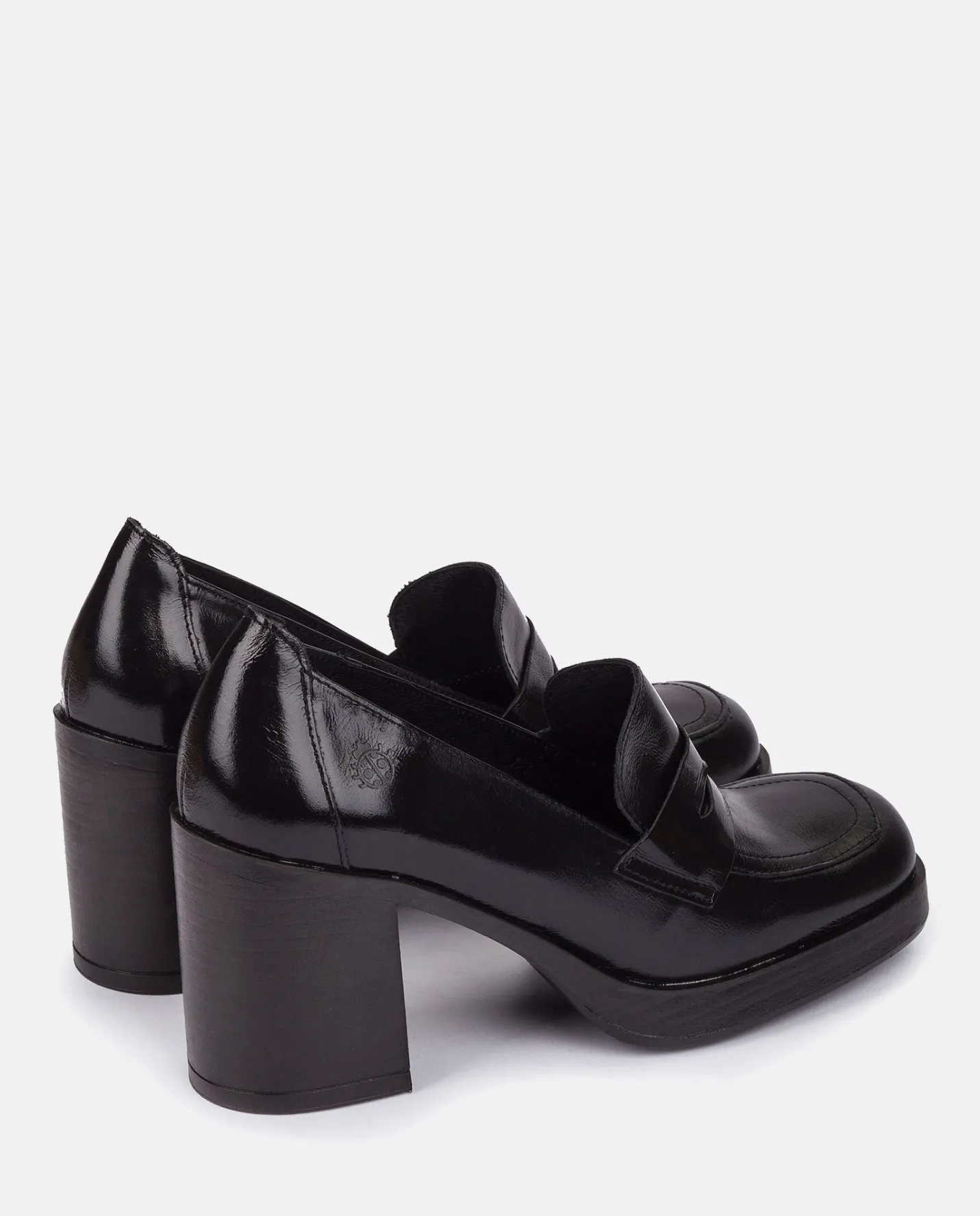 El modelo estilo mocasín con punta cuadrada KOLIN 004 en negro. Ha sido diseñado en piel vacuna con un tacón de 8 cm, estético, elegante y súper cómodo ¿A qué esperas? Fabricado en España. Está elaborado de manera artesanal, material de piel vacuna y uso de tintes vegetales respetuosos con el medio ambiente.