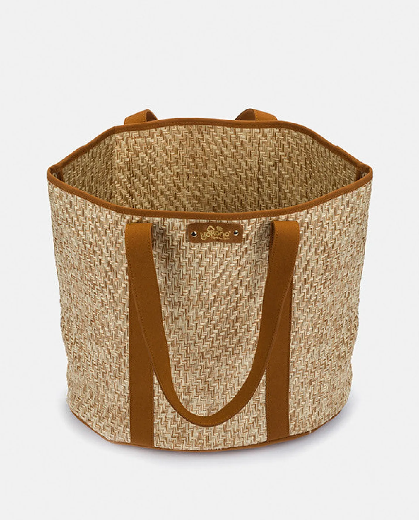 Bolso Guirao 001 en beige. Material rafia y un pequeño estuche a juego, ideal para guardar accesorios. Cuenta con dos asas y el tamaño perfecto para incluirlo en todos tus planes de verano.