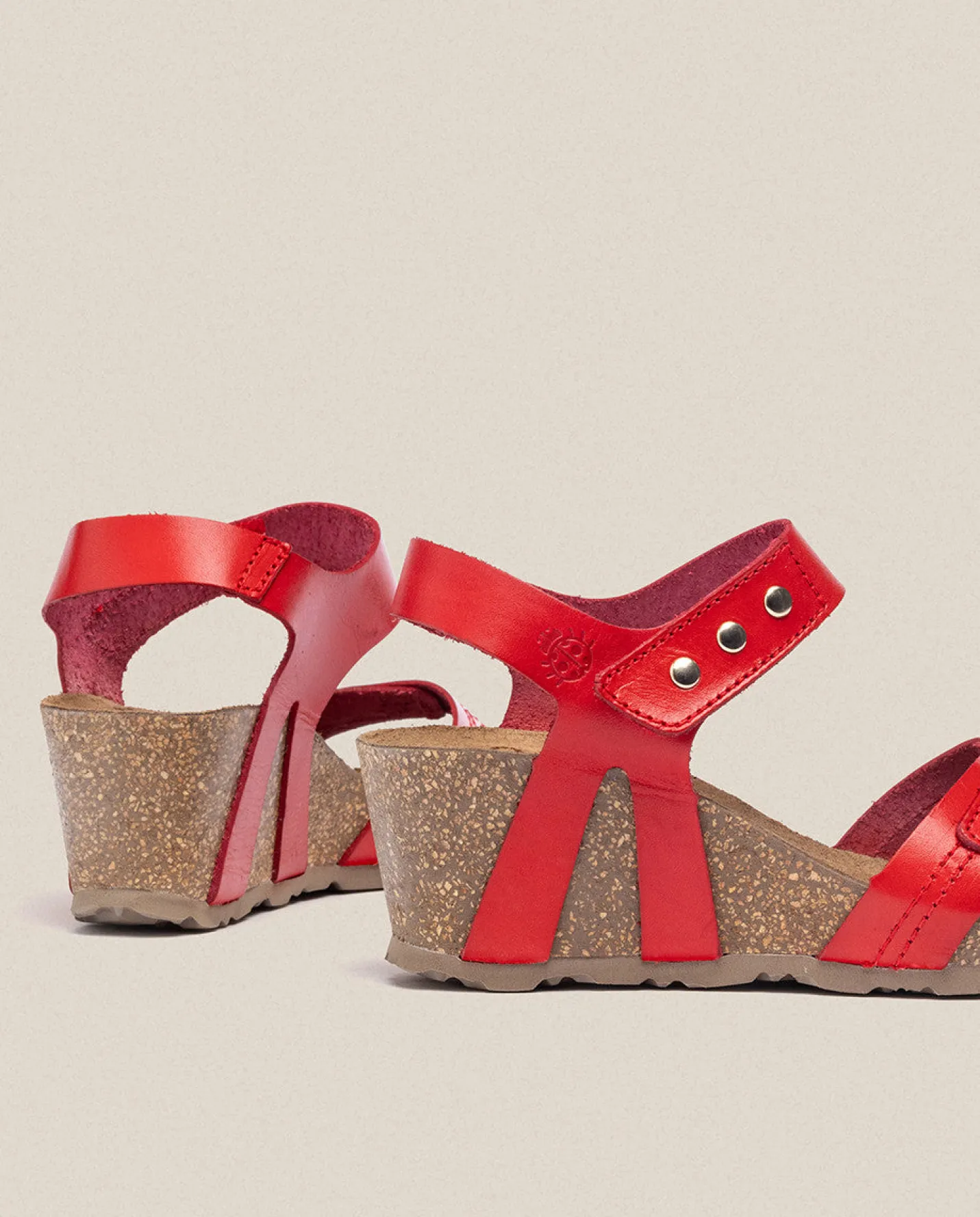 La sandalia de cuña CADIZ 303 en rojo, cierre de veldro y tachuelas como detalle principal en su diseño. Perfecta para combinar con cualquier look y aportar un toque elegante a tu día a día. Tiene una cuña de 5,5 cm y una plantilla antideslizante que garantiza el agarre. Está elaborada de manera artesanal en España, material de piel y uso de tintes vegetales respetuosos con el medio ambiente.