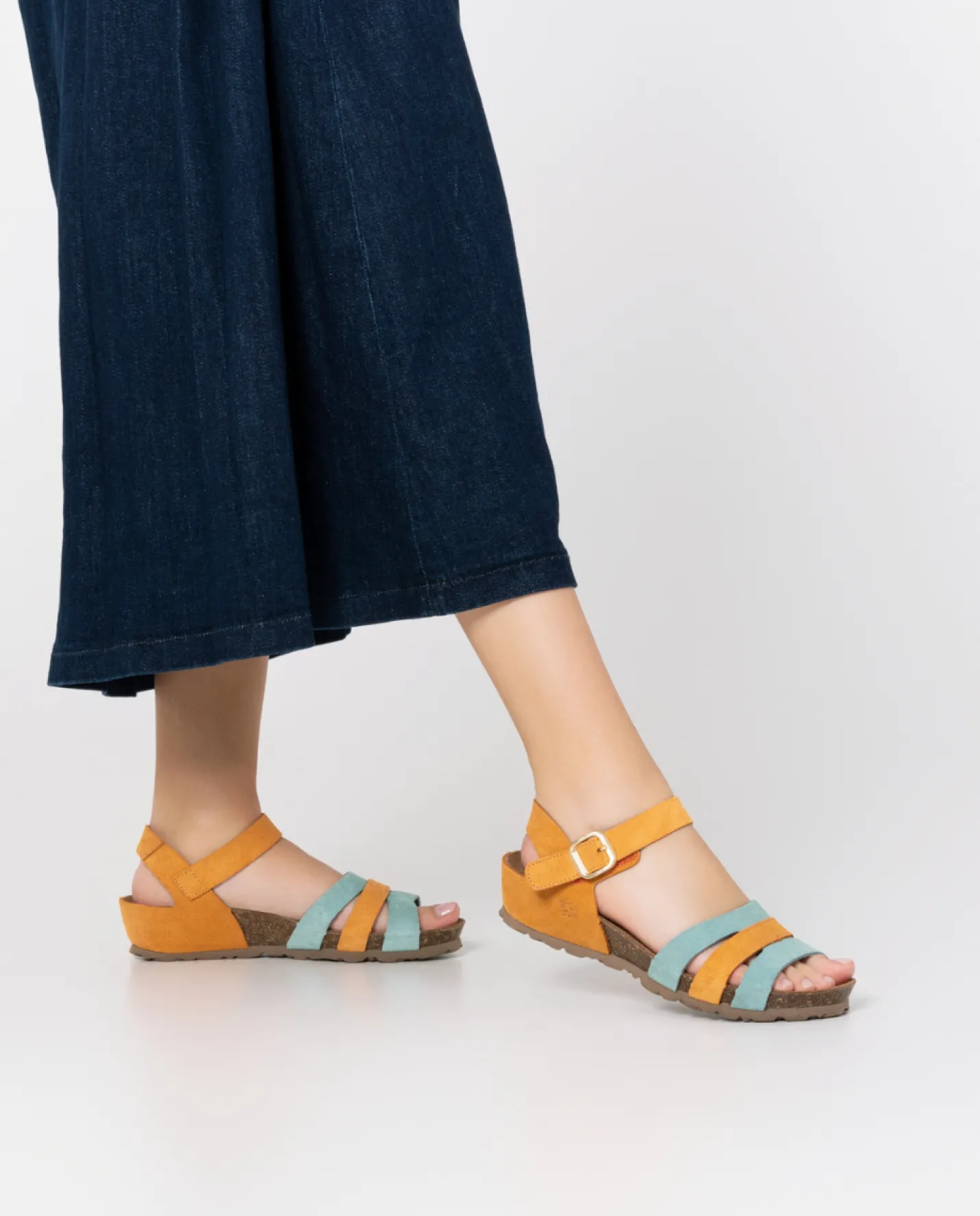 La sandalia de cuña MONACO 048 en naranja y verde, una sandalia cómoda, elegante y que aportará un toque de color a tus looks. Cierre de velcro y hebilla decorativa que permite el ajuste al pie, garantizando el máximo confort. Cuenta con una suela de 3,5 cm y una plantilla antideslizante que garantiza el agarre del pie. Está elaborada de manera artesanal en España, material de piel y uso de tintes vegetales respetuosos con el medio ambiente.