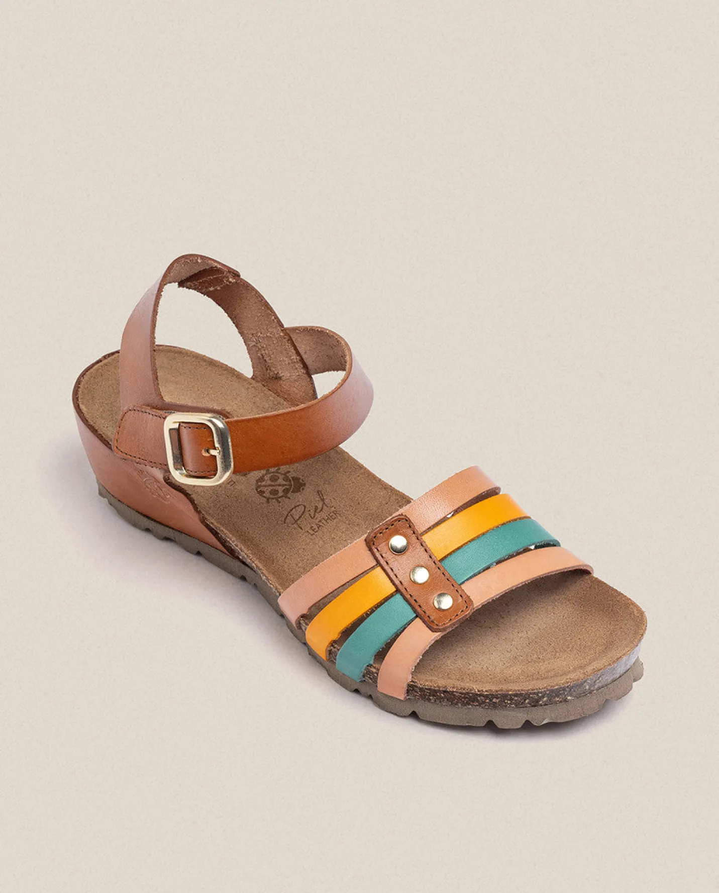 La sandalia de cuña MONACO 051 en marrón oscuro, una sandalia hecha para tu día a día y para tu comodidad. Combinable con todos los looks, desde los más simples hasta los más atrevidos. Tiras multi colores, por si buscas un toque más divertido. Hebilla decorativa y cierre de velcro, cuenta con una suela de 3,5 cm y una plantilla antideslizante que garantiza el agarre del pie. Está elaborada de manera artesanal en España, material de piel y uso de tintes vegetales respetuosos con el medio ambiente.