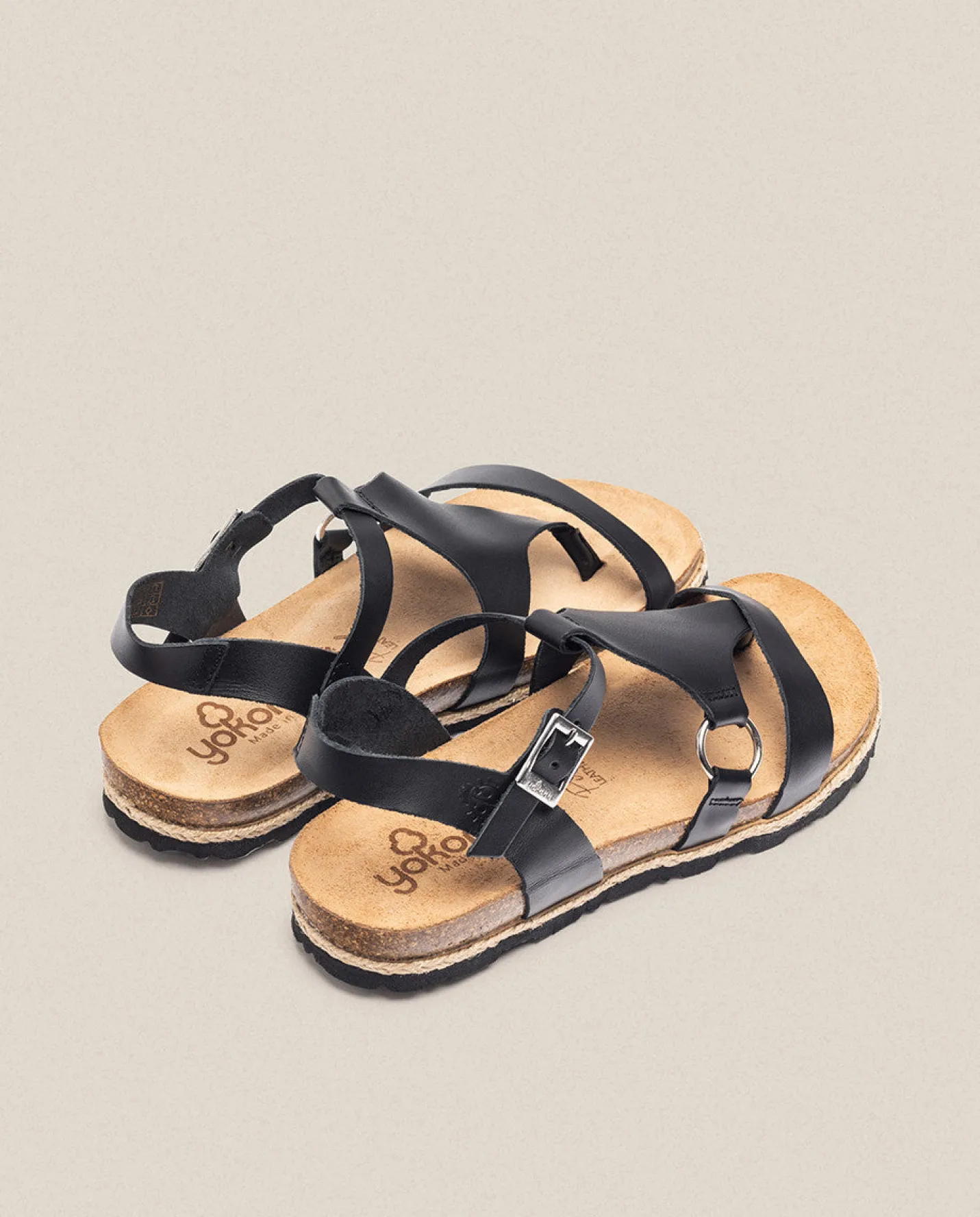 Sandalia de plataforma de color negro con una altura de 2,5 cm. Diseño formado por unas tiras entrecruzadas que aportan un toque único y distintivo. Pequeña circunferencia en el lateral. El modelo icónico que no puede faltar si deseas comodidad en cada pisada. Cierre de hebilla. Piso de yute. Corte de piel vacuna. Plantilla acolchada y antideslizante que añade un extra de comodidad. Elaborada mediante un proceso de fabricación artesanal que usa tintes vegetales y embalajes sostenibles para respetar el medio ambiente. Fabricada en España.
