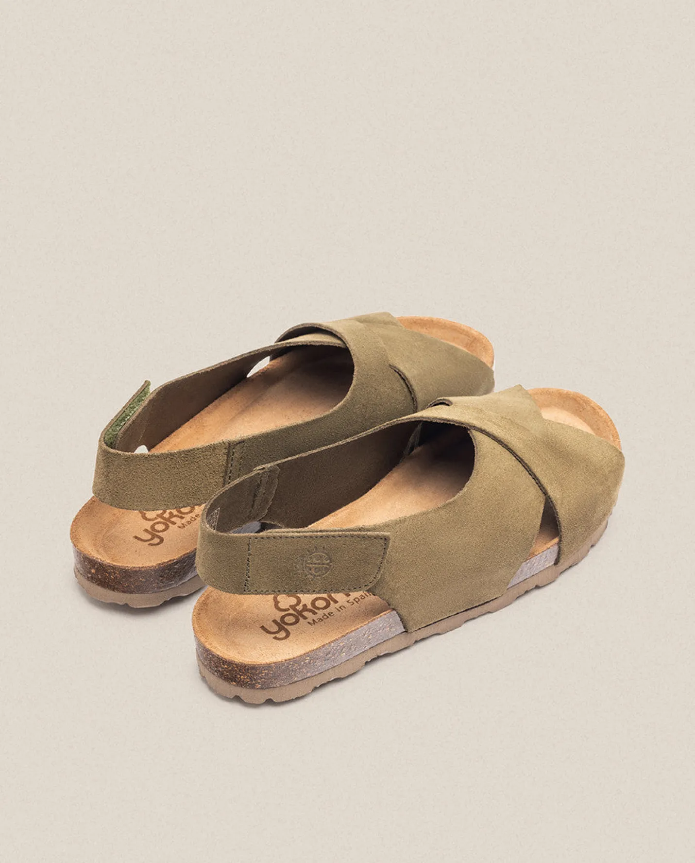 Sandalia plana de color verde con una altura de 2 cm. Diseño formado por dos suaves tiras entrecruzas entre sí y un cómodo cierre de velcro. Versatilidad y comodidad en un mismo modelo. Corte de piel vacuna. Plantilla acolchada y antideslizante que añade un extra de comodidad. Elaborada mediante un proceso de fabricación artesanal que usa tintes vegetales y embalajes sostenibles para respetar el medio ambiente. Fabricada en España.